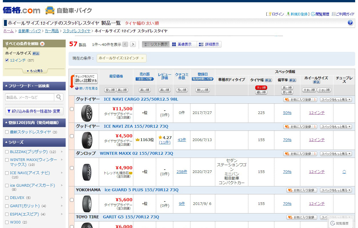 ですが、インターネットの商品(タイヤ)検索サイトを利用し、『12インチのスタッドレスタイヤ』を検索すると・・・