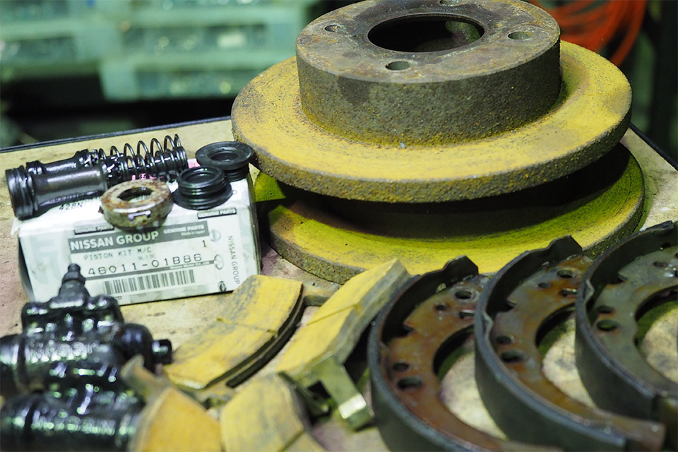 製造から30年近く経過しているパオ・フィガロは、ブレーキパッドとローターだけの交換では、本来の制動力が発揮できません。キャリパーやブレーキホースなども錆や傷、硬化などにより交換が必要な場合がとても多いです。また、部品の交換だけでなく調整も重要で、それぞれの部品が正しく動作するようにすることも大事です。