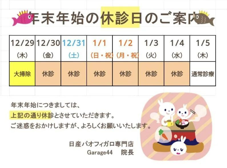 院長より年末年始のお知らせが届きましたのでBlogでもご案内させていただきます。 うちの店主の肩書きがいつのまにか院長に変わってた。